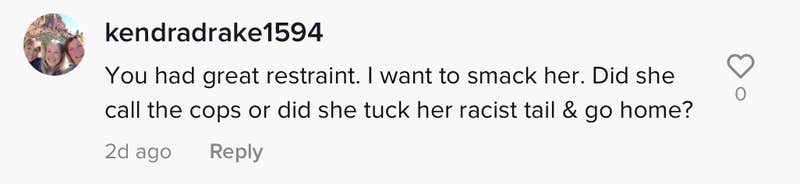 "You had great restraint," one commenter wrote. "I want to smack her. Did she call the cops or did she tuck her racist tail and go home?"