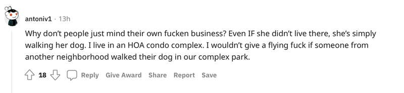 "Why don’t people just mind their own fucken business?" u/antoniv1 wrote. "Even IF she didn’t live there, she’s simply walking her dog. I live in an HOA condo complex. I wouldn’t give a flying fuck if someone from another neighborhood walked their dog in our complex park."