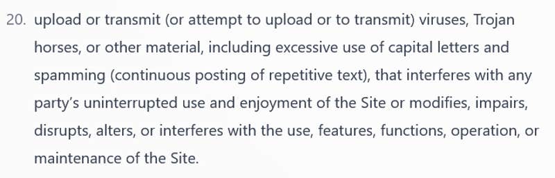 Perhaps the most out-there agreement a user has to make for using the site is being OK with not using "excessive capital letters." Trump infamously used capital letters in hundreds of his tweets before being banned.