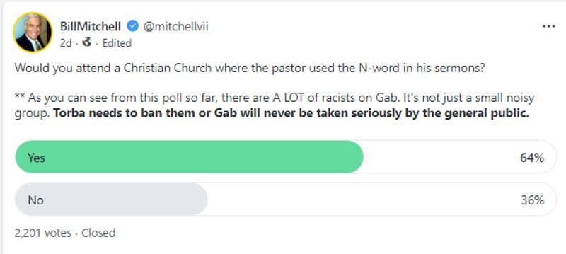 "As you can see from this poll so far, there are A LOT of racists on Gab," Mitchell wrote. "It's not just a small noisy group."