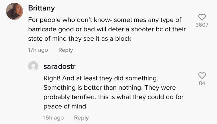 "For people who don't know—sometimes any type of barricade good or bad will deter a shooter because of their state of mind they see it as a block," another commenter wrote.