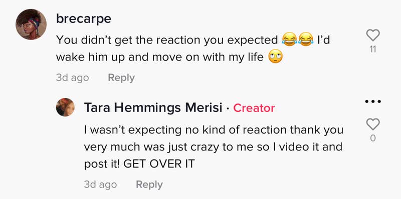 A follow-up video shows her boyfriend trying to wake the sleeping man, asking if he is OK.