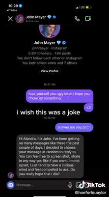 One fan may have taken it a bit too far after she sent hate to Mayer via Instagram message. She showed the note in a series of viral TikToks, one of which received 11,000 likes before all videos were set to private. Although the videos are no longer viewable, the DM has made its way to Twitter and Deuxmoi.