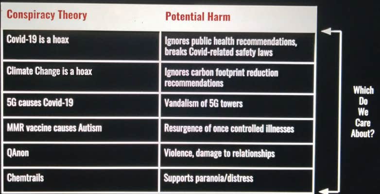 The paper names several types of conspiracies, such as QAnon and chemtrails, and their potential harms. Facebook implies that QAnon is the worst of these. It alone is said to have the potential to cause "violence [and] damage to relationships."