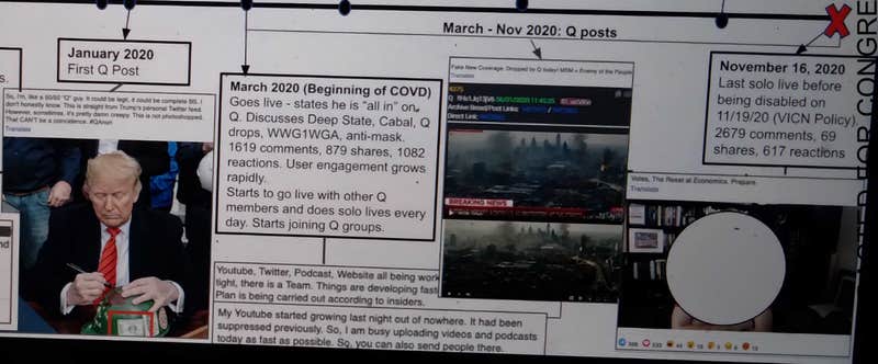 In Jan. 2020, this individual went full QAnon, according to Facebook. In a Facebook live at the beginning of the pandemic, he discussed a wide breadth of QAnon theories and catchphrases, the company says. That June, he launched a Facebook group that spread QAnon theories. Within a month, it had nearly 9,000 members.