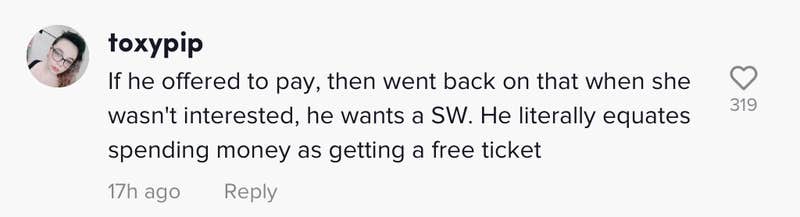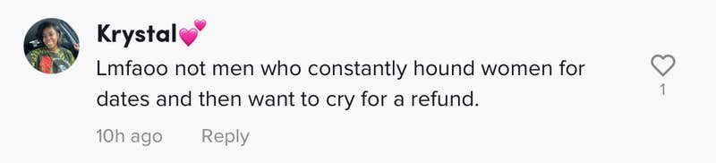 "Another example of men feeling entitled to a woman just for buying dinner and the asking for their $ back when they don't get what they want," one viewer wrote in a top comment.