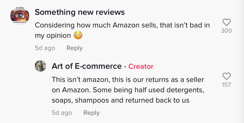 "This isn't Amazon, this is our returns as a seller on Amazon," they wrote. "Some being half used detergents, soaps, shampoos and returned back to us."