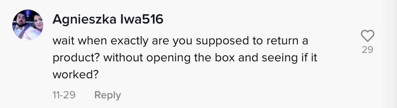"Wait when exactly are yo supposed to return a product?" one commenter wrote. "Without opening the box and seeing if it worked?"