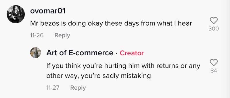 An Amazon seller on TikTok called out customers who make returns to online retailers.