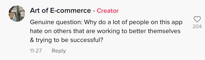 "Genuine question: why do a lot of people on this app hate on others that are working to better themselves and trying to be successful?" they wrote.