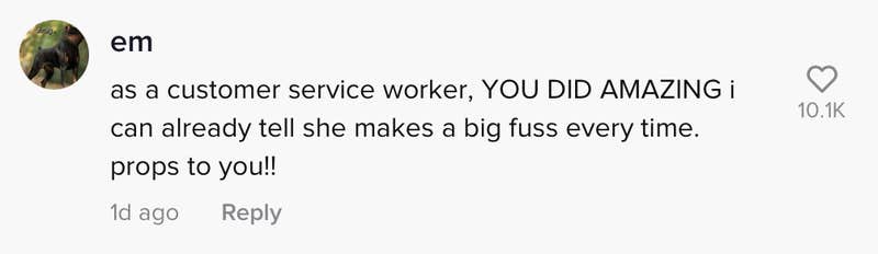 "As a customer service worker, you did amazing," one commenter wrote. "I can already tell she makes a big fuss every time. Props to you!"
