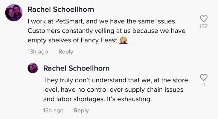 "I work at PetSmart, and we have the same issues," one commenter wrote. "Customers constantly yelling at us because we have empty shelves of Fancy Feast. They truly don't understand that we, at the store level, have no control over supply chain issues and labor shortages. It's exhausting."