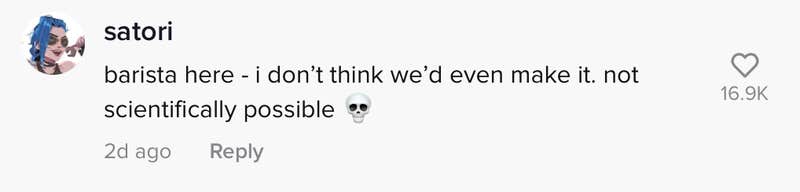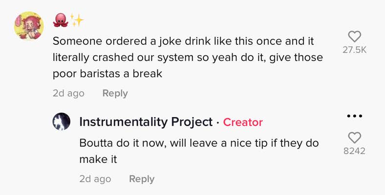 One such commenter claimed that someone else had tried to do this before and that it crashed their point of sale system. "Someone ordered a joke drink like this once and it literally crashed our system so yeah do it, give those baristas a break," they wrote.