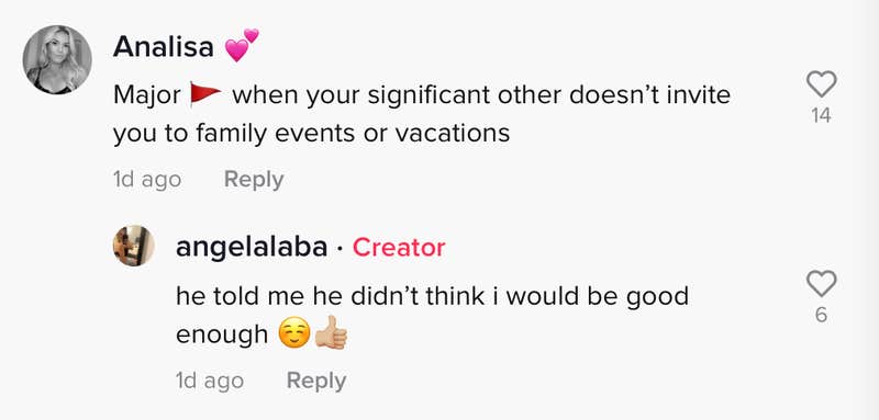 "Major (red flag) when your significant other doesn't invite you to family events or vacations," the commenter wrote.
