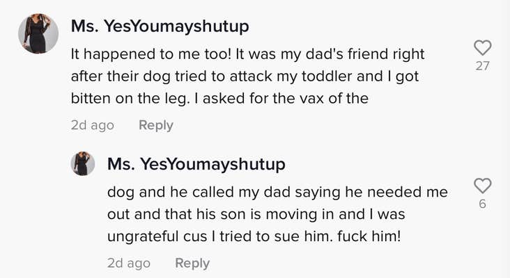"It was my dad's friend right after their dog tried to attack my toddler and I got bitten on the leg," they wrote. "I asked for the vax of the dog and he called my dad saying he needed me out and that his son was moving in and I was ungrateful (because) I tried to sue him."