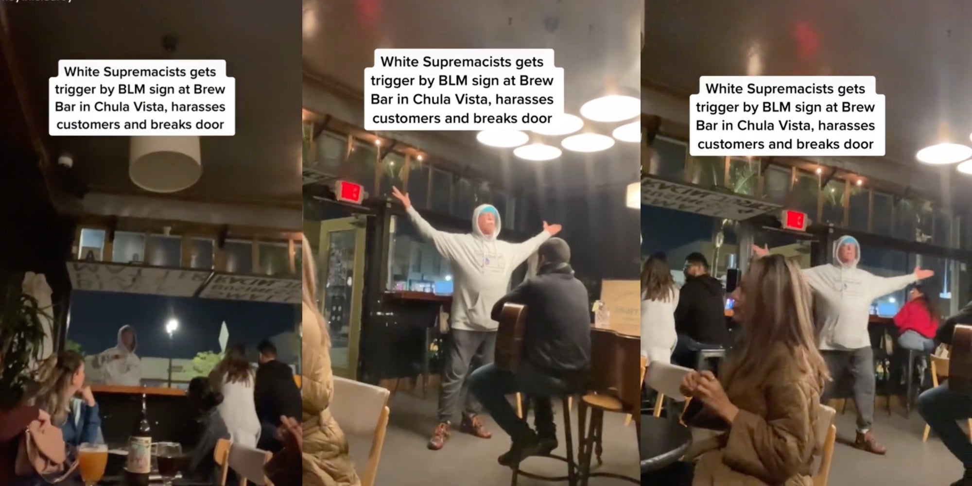 "White Supremacist gets trigger by BLM sign at Brew Bar in Chula Vista, a suburb of San Diego, harasses customers and breaks door," a text overlay on the video reads.