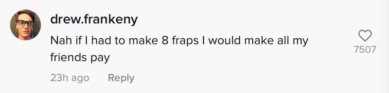 TikToker @m.amya said in a video on Dec. 3. The TikToker ultimately clarified in the comments section that she was joking.Some users argued that if their friends ordered that many Frappuccinos, they would make them pay for it. "Nah if I had to make eight fraps I would make all my friends pay," one user wrote.