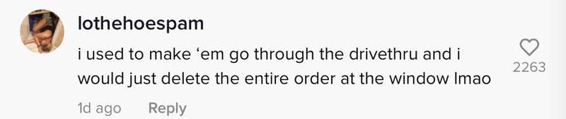 "I used to make 'em go through the drive thru and I would just delete the entire order at the window lmao," one wrote.