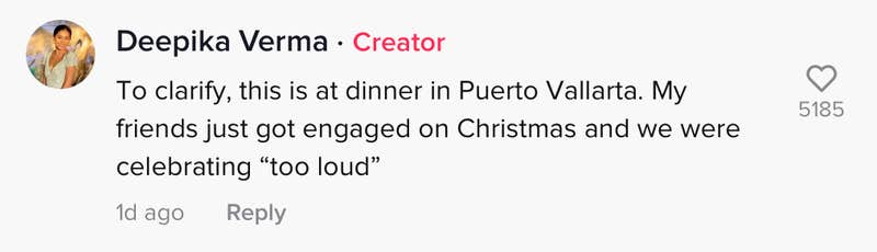 "To clarify, this is at dinner in Puerto Vallarta," the poster @deepikaverma91096 wrote. "My friends just got engaged on Christmas and we were celebrating 'too loud.'"