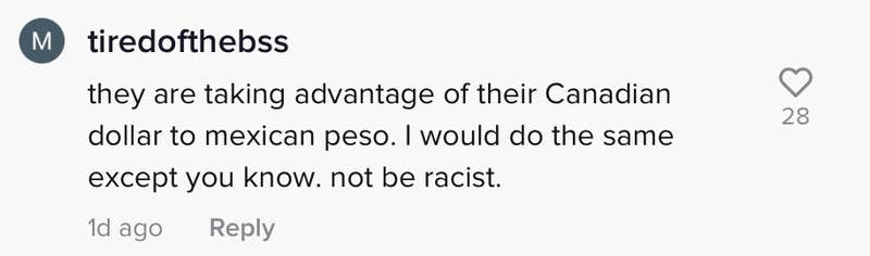 "They are taking advantage of their Canadian dollar to Mexican peso," one commenter wrote. "I would do the same except you know. Not be racist."