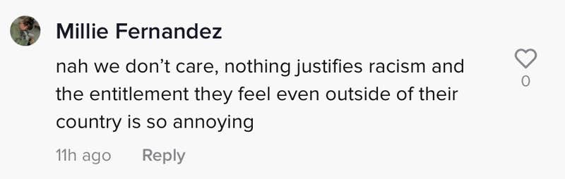"Nah, we don't care, nothing justifies racism and the entitlement they feel even outside of their country is so annoying," one such commenter wrote.