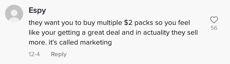 "They want you to buy multiple $2 packs so you feel like you're getting a great deal and in actuality they sell more," one commenter wrote. "It's called marketing."