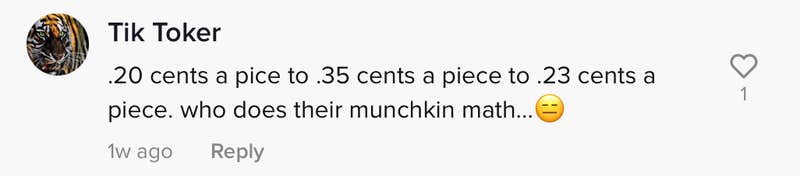 ".20 cents a (piece) to .35 cents a piece to .23 cents a piece," they wrote. "Who does their munchkin math."