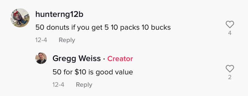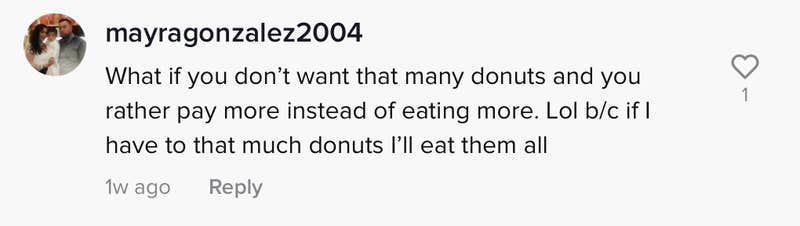 "What if you don't want that many donuts and you rather pay more instead of eating more," the commenter wrote. "Lol because if I have that much donuts I'll eat them all."