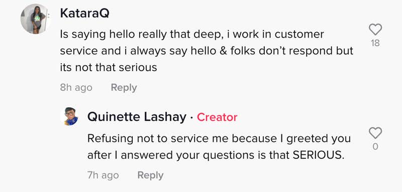 Viewers were shocked at the employee's behavior and comments. Some said she simply wasn't built for customer service. Others called out her attitude and excuse for refusing to greet the TikToker.