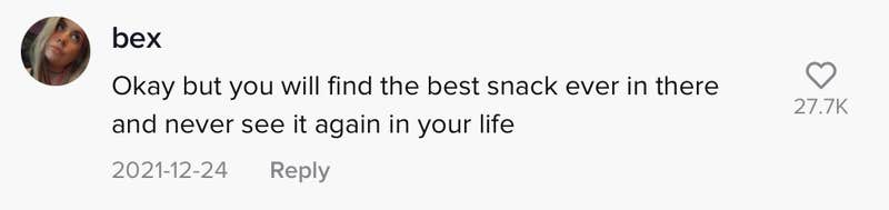 "Okay but you will find the best snack ever in there and never see it again in your life," one commenter wrote.