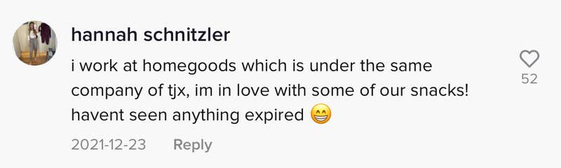 "I work at Homegoods which is under the same company of TJX, I'm in love with some of our snacks!" one commenter wrote. "Haven't seen anything expired."