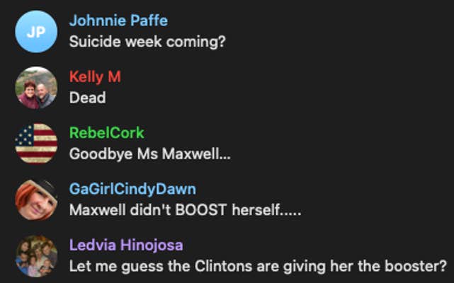 Over on Telegram, users also viewed the booster as a covert method to permanently silence Maxwell. After the news was shared by QAnon promoter StormyPatriotJoe, users began pointing fingers at Bill and Hillary Clinton. Bill is known to have repeatedly flown on Epstein's private jet but has denied any wrongdoing.