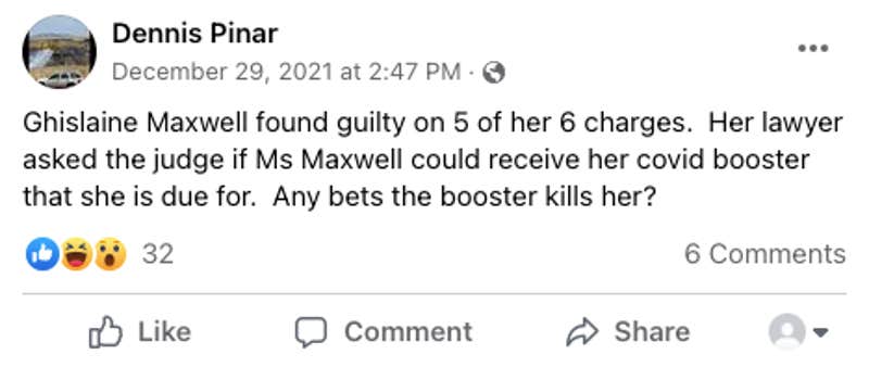 "Ghislaine Maxwell was found guilty on 5 of her 6 charges," one user wrote. "Her lawyer asked the judge if Ms Maxwell could receive her covid booster that she is due for. Any bets the booster kills her?"