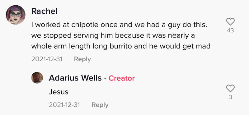 "I work at Chipotle once and we had a guy do this," one such commenter wrote. "We stopped serving him because it was nearly a whole arm length burrito and he would get mad."