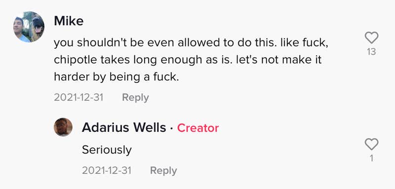 "You shouldn't be even allowed to do this," one commenter wrote. "Like fuck, Chipotle takes long enough as is. Let's not make it harder by being a fuck."